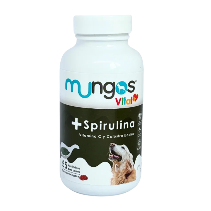 Mungos VITAL+ Spirulina es un suplemento alimenticio completo, elaborado con ingredientes naturales de alto valor biológico como espirulina, calostro bovino, levadura nutricional y vitamina C. Su fórmula está diseñada para mejorar la salud celular, reforzar el sistema inmune y aportar energía de forma natural.